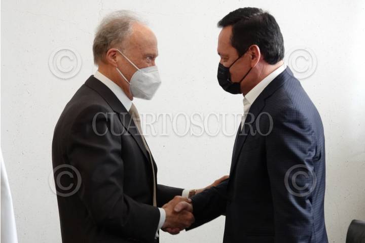 Alejandro Gertz Manero, fiscal General de la República, y el senador Miguel Ángel Osorio Chong, se saludaron durante la llegada de la comparecencia ante la JUCOPO en el Senado de la República