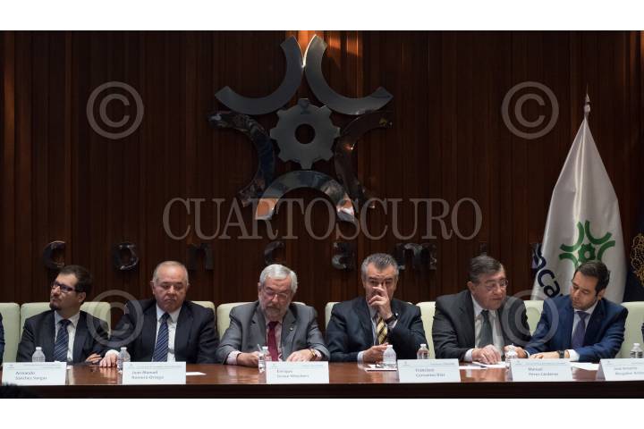 CIUDAD DE MÉXICO, 17JUNIO2019.- Armando Sánchez Vargas, titular del Instituto de Investigaciones Sociales; Juan Manuel Romero Ortega, titular de la Coordinación de Innovación y Desarrollo (CID); Enrique Graue, rector de la UNAM; Francisco Cervantes Díaz, presidente de la Confederación de Cámaras Industriales de los Estados Unidos Mexicanos (CONCAMIN); Manuel Pérez Cárdenas, jefe de la oficina de la presidencia de la CONCAMIN y José Antonio Abugaber Andonie, presidente del Consejo Coordinador Empresarial (CCE) de León, durante la firma del convenio CONCAMIN-UNAM, el cual es una alianza en favor de la transformación Industrial en México. El acto se realizó en el Auditorio de la CONCAMIN. FOTO: GRACIELA LÓPEZ /CUARTOSCURO.COM