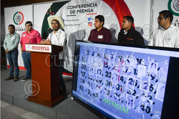 CIUDAD DE MÉXICO, 26SEPTIEMBRE2023.- Manuel Vázquez Arellano, diputado de Morena, junto a sobrevivientes del caso Ayotzinapa, ofreció conferencia en la Cámara de Diputados con motivo del noveno aniversario de las desaparición de los 43 normalistas de Ayotzinapa. FOTO: MARIO JASSO/CUARTOSCURO.COM