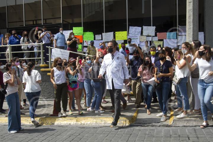 Padres de familia, niños y maestros de colegios privados en Nuevo León, exigen al Secretario de Salud; Manuel de la O, regreso a clases presenciales y cursos de verano, en las afueras de la secretaría de salud pública.