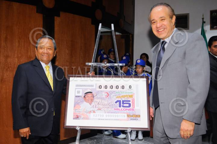 MÉXICO, D.F., 28JUNIO2011.- La Lotería Nacional realizó un homenaje a través del billete conmemorativo al compositor, Armando Manzanerollevado acabo en sus instalaciones. Lo acompaña, Benjamín González Roaro director del Instituto. FOTO: FRANCISCO RODRÍGUEZ/CUARTOSCURO.COM
