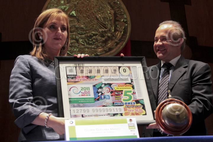 MÉXICO, D.F., 28SEPTIEMBRE2011.- Gloria Guevara Manzo, Secretaría del Turismo federal junto a Benjamín González Roaro, Director General de la Loteria Nacional durante el sorteo dedicado al año del turismo en México. FOTO: ENRIQUE ORDÓÑEZ/CUARTOSCURO.COM