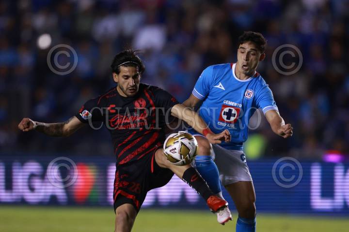 CIUDAD DE MÉXICO, 30NOVIEMBRE2024. Jesús Gómez de Xolos disputa una pelota a Lorenzo Faravelli de la Máquina Celeste durante el partido de fútbol Cruz Azul vs Tijuana correspondiente a la vuelta de cuartos de final del Torneo Apertura 2024 de Liga BBVA MX, en el Estadio Ciudad de los Deportes. FOTO: EDGAR NEGRETE LIRA/CUARTOSCURO.COM