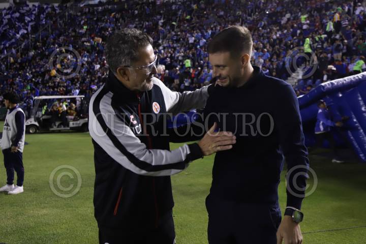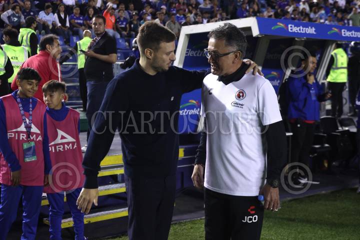 CIUDAD DE MÉXICO, 30NOVIEMBRE2024. El DT Juan Carlos Osorio saluda al DT Martín Anselmi previo al partido de fútbol Cruz Azul vs Tijuana correspondiente a la vuelta de cuartos de final del Torneo Apertura 2024 de Liga BBVA MX, en el Estadio Ciudad de los Deportes. FOTO: EDGAR NEGRETE LIRA/CUARTOSCURO.COM