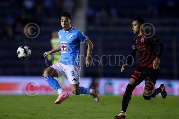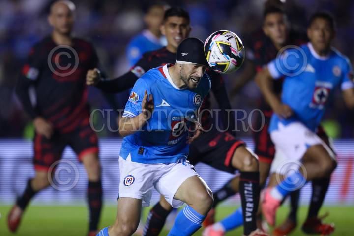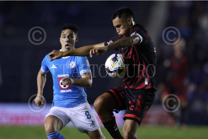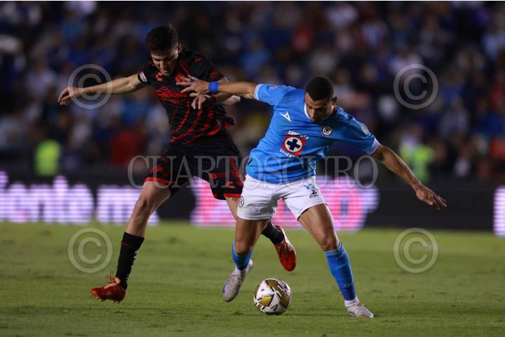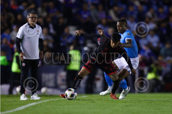 CIUDAD DE MÉXICO, 30NOVIEMBRE2024. Ángel Sepúlveda de la Máquina Celeste tira a gol dejando a tras la marca de Aarón Mejía de Xolos durante el partido de fútbol Cruz Azul vs Tijuana correspondiente a la vuelta de cuartos de final del Torneo Apertura 2024 de Liga BBVA MX, en el Estadio Ciudad de los Deportes. FOTO: EDGAR NEGRETE LIRA/CUARTOSCURO.COM