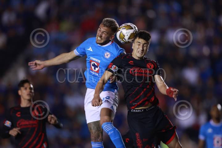 CIUDAD DE MÉXICO, 30NOVIEMBRE2024. Gonzalo Piovi de la Máquina Celeste cabecea un balón junto a Rafael Fernández de Xolos durante el partido de fútbol Cruz Azul vs Tijuana correspondiente a la vuelta de cuartos de final del Torneo Apertura 2024 de Liga BBVA MX, en el Estadio Ciudad de los Deportes. FOTO: EDGAR NEGRETE LIRA/CUARTOSCURO.COM