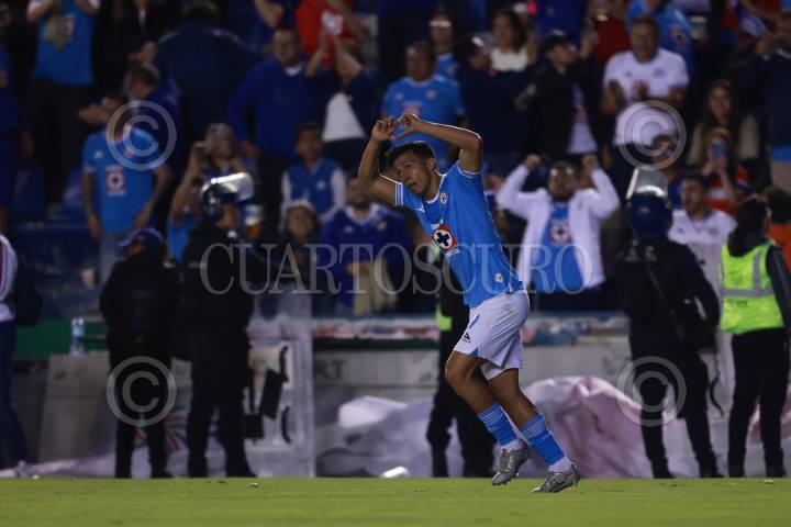 CIUDAD DE MÉXICO, 30NOVIEMBRE2024. Ángel Sepúlveda de la Máquina Celeste festeja su anotación durante el partido de fútbol Cruz Azul vs Tijuana correspondiente a la vuelta de cuartos de final del Torneo Apertura 2024 de Liga BBVA MX, en el Estadio Ciudad de los Deportes. FOTO: EDGAR NEGRETE LIRA/CUARTOSCURO.COM