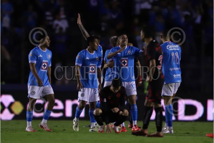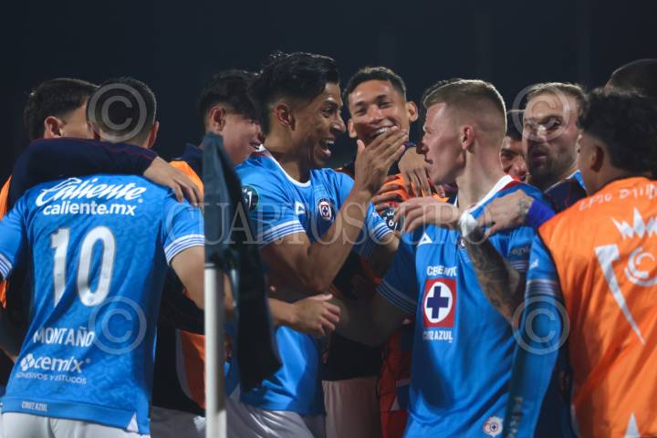 CIUDAD DE MÉXICO, 30NOVIEMBRE2024. Festejo del Buda gorra del Cruz Azul y lamento de jugadores de Xolos al término del partido de fútbol Cruz Azul vs Tijuana correspondiente a la vuelta de cuartos de final del Torneo Apertura 2024 de Liga BBVA MX, en el Estadio Ciudad de los Deportes. FOTO: EDGAR NEGRETE LIRA/CUARTOSCURO.COM