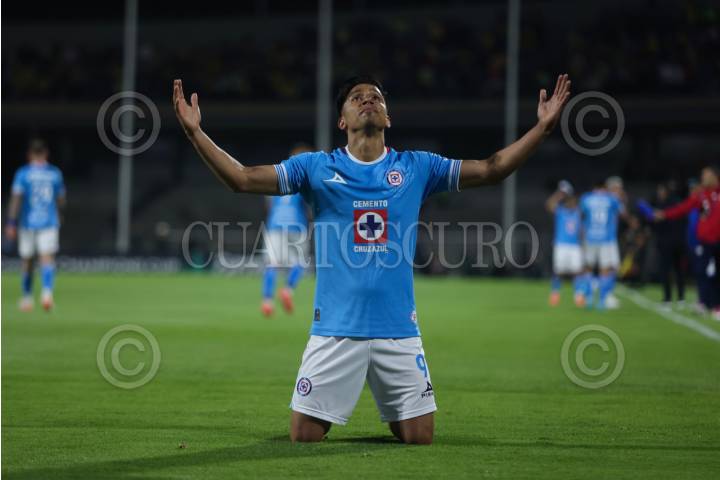 CIUDAD DE MÉXICO, 08ABRIL2025. Festejo de Ángel Sepulveda durante el partido de fútbol Cruz Azul vs América correspondiente a la vuelta de los cuartos de final de la Copa de Campeones de la Concacaf, en el Estadio Olímpico Universitario. FOTO: EDGAR NEGRETE LIRA/CUARTOSCURO.COM