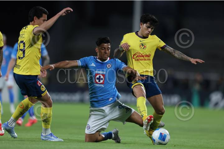 CIUDAD DE MÉXICO, 08ABRIL2025.Jorge Sánchez de La Máquina y Alvaro Fidalgo de las Águilas disputan una pelota durante el Partido de fútbol Cruz Azul vs América correspondiente a la vuelta de los cuartos de final de la Copa de Campeones de la Concacaf, en el Estadio Olímpico Universitario. FOTO: EDGAR NEGRETE LIRA/CUARTOSCURO.COM