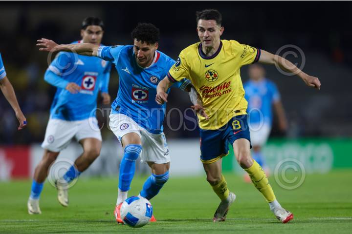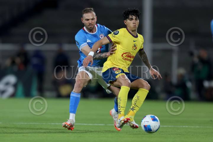 CIUDAD DE MÉXICO, 08ABRIL2025. Carlos Rotondi de La Máquina disputa una pelota a Kevin Álvarez de las Águilas durante el partido de fútbol Cruz Azul vs América correspondiente a la vuelta de los cuartos de final de la Copa de Campeones de la Concacaf, en el Estadio Olímpico Universitario. FOTO: EDGAR NEGRETE LIRA/CUARTOSCURO.COM
