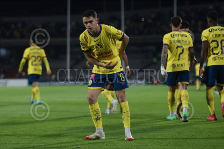 CIUDAD DE MÉXICO, 08ABRIL2025. Festejo de Álvaro Fidalgo durante el partido de fútbol Cruz Azul vs América correspondiente a la vuelta de los cuartos de final de la Copa de Campeones de la Concacaf, en el Estadio Olímpico Universitario. FOTO: EDGAR NEGRETE LIRA/CUARTOSCURO.COM