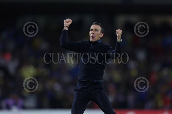 CIUDAD DE MÉXICO, 08ABRIL2025. El DT Vicente Sánchez festeja durante el partido de fútbol Cruz Azul vs América correspondiente a la vuelta de los cuartos de final de la Copa de Campeones de la Concacaf, en el Estadio Olímpico Universitario. FOTO: EDGAR NEGRETE LIRA/CUARTOSCURO.COM