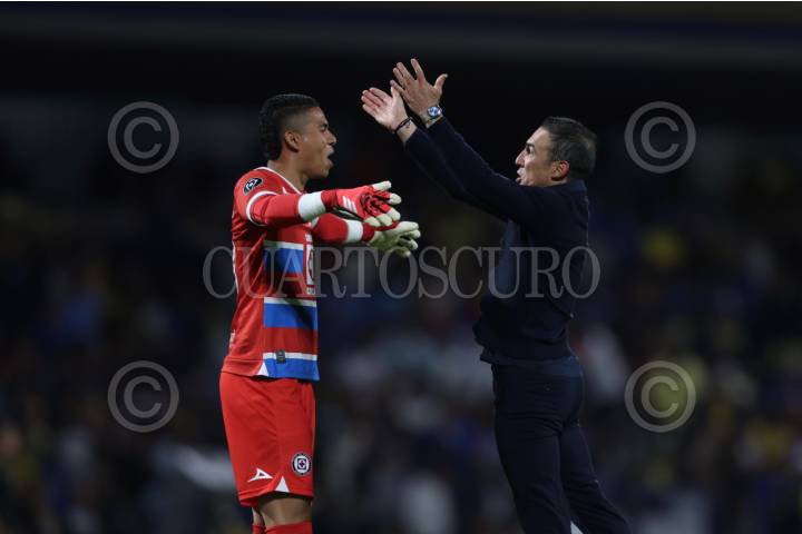 CIUDAD DE MÉXICO, 08ABRIL2025. El portero Kevin Mier se abraza con el Director Técnico Vicente Sánchez tras conseguir la victoria del partido de fútbol Cruz Azul vs América correspondiente a la vuelta de los cuartos de final de la Copa de Campeones de la Concacaf, en el Estadio Olímpico Universitario. FOTO: EDGAR NEGRETE LIRA/CUARTOSCURO.COM