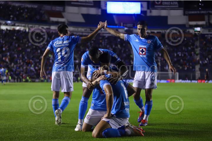 CIUDAD DE MÉXICO, 08ABRIL2025. Festejo del jugadores de La Máquina durante el partido de fútbol Cruz Azul vs América correspondiente a la vuelta de los cuartos de final de la Copa de Campeones de la Concacaf, en el Estadio Olímpico Universitario. FOTO: EDGAR NEGRETE LIRA/CUARTOSCURO.COM
