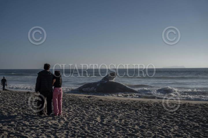 TIJUANA BAJA CALIFORNIA 18AGOSTO2025.- Pareja observando el cuerpo de la ballena. El cuerpo de una ballena fue hallada en la orilla de Playas de Tijuana, la tarde del lunes 18 de agosto cerca de la Estación de Salvavidas #14 en las inmediaciones del fraccionamiento La Perla. El hallazgo generó sorpresa entre las personas que se encontraban en la playa, quienes se acercaron para tomar fotos y videos. Autoridades municipales informaron la activación del protocolo para mamíferos marinos varados en coordinación con La Procuraduría Federal del Protección al Ambiente. (PROFEPA). FOTO: OMAR MARTÍNEZ/ CUARTOSCURO.COM