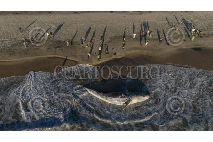 TIJUANA BAJA CALIFORNIA 18AGOSTO2025.- Imagen área del cuerpo de una ballena en la orilla de Playas de Tijuana. El cuerpo de una ballena fue hallada en la orilla de Playas de Tijuana, la tarde del lunes 18 de agosto cerca de la Estación de Salvavidas #14 en las inmediaciones del fraccionamiento La Perla. El hallazgo generó sorpresa entre las personas que se encontraban en la playa, quienes se acercaron para tomar fotos y videos. Autoridades municipales informaron la activación del protocolo para mamíferos marinos varados en coordinación con La Procuraduría Federal del Protección al Ambiente. (PROFEPA). FOTO: OMAR MARTÍNEZ/ CUARTOSCURO.COM