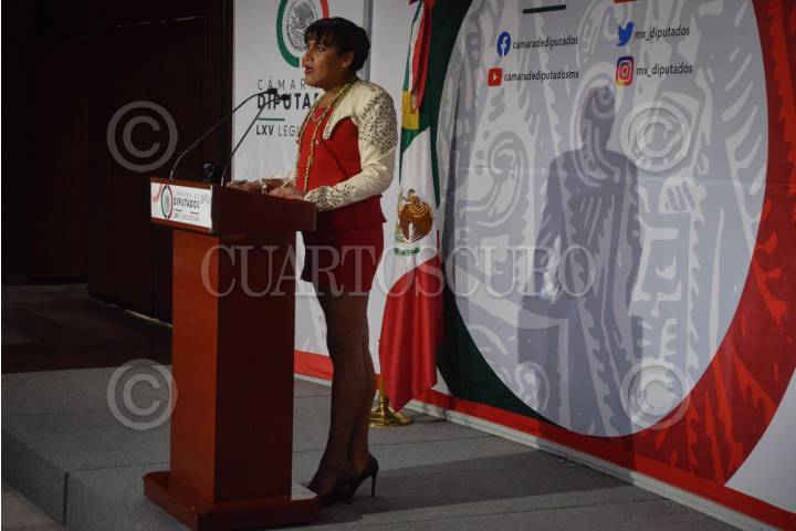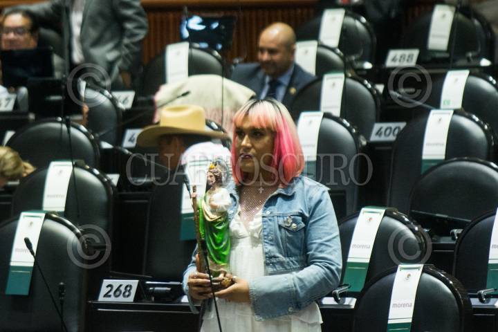 María Clemente García , diputada de Morena sostiene una figura de "Judas Tadeo", durante la sesión ordinaria de la Cámara de Diputados.