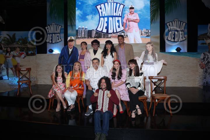 CIUDAD DE MÉXICO, 10SEPTIEMBRE2024. Mariana Botas, Luz Edith Rojas, Zully Keith, Oswaldo Zárate, Jorge Ortiz de Pinedo, Andrea Torre, Wendy Braga, Moises Iván Mora, El Chevo y María Fernanda García durante la presentación de la temporada 11 de la serie cómica “Una Familia de Diez”, una producción de Televisa Univision. FOTO: EDGAR NEGRETE LIRA/CUARTOSCURO.COM