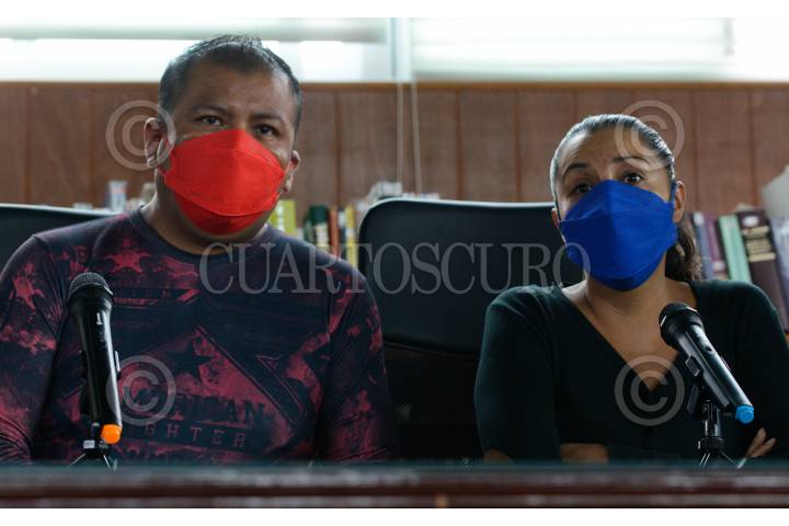 Marco Antonio Olivares, abogado; Raúl Reyes y María Guadalupe Lezama, padres del menor presuntamente violentado sexualmente por Saúl Huerta, diputado de Morena; y Teófilo Benítez, nuevo abogado encargado del caso, durante conferencia de prensa informaron sobre las acciones legales que realizarán ante el posible desafuero del diputado, que se prevé sea discutido ante el pleno de la Cámara de Diputados la próxima semana.