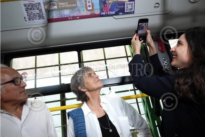 Claudia Curiel de Icaza, secretaria de Cultura de la Ciudad de México,toma fotografías del código QR para descargar la app par obtener la app de Cine a Bordo en el transporte colectivo RTP