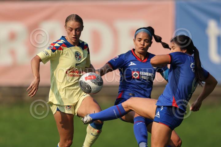 CIUDAD DE MÉXICO, 29MARZO2024. Sarah Luebbert de las Águilas disputa una pelota a las defensas María Peraza y Jazmín Castañon de la Máquina Celeste durante el partido de fútbol Cruz Azul vs América correspondiente a la jornada 13 del Torneo Clausura 2024 de Liga BBVA MX Femenil, en instalaciones de La Noria. FOTO: EDGAR NEGRETE/CUARTOSCURO.COM