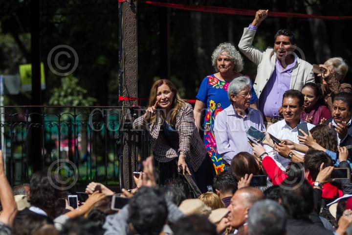 CIUDAD DE MÉXICO, 05JULIO2018.- María Rojo, candidata por Morena a la alcaldía de Coyoacán, encabezó una asamblea en la explanada de dicha demarcación, en donde aseguró que cuenta con las pruebas para impugnar la elección del pasado domingo, en las cuales resultó ganadora la coalición PAN-PRD-MC. FOTO: ISAAC ESQUIVEL /CUARTOSCURO.COM