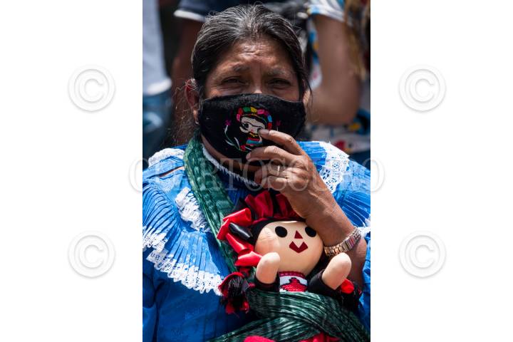 Una mujer acompañada de una muñeca otomí se observa durante la protesta de dicha comunidad a un costado de la SCJN