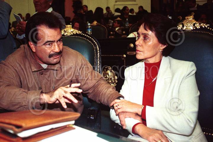 Fernando Espino, diputado priísta y líder sindical del metro, platica con María de los Angeles Moreno, líder de la bancada priísta en la Asamblea capitalina, durante la sesión ordinaria de esta cámara. FOTO: Juan Pablo Zamora/CUARTOSCURO.COM
