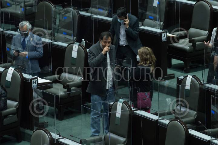 Gerardo Fernández Noroña, diputado del Partido del Trabajo (PT) platica con María de los Ángeles Huerta, diputada de Morena, durante la sesión ordinaria semipresencial de la Cámara de Diputados.