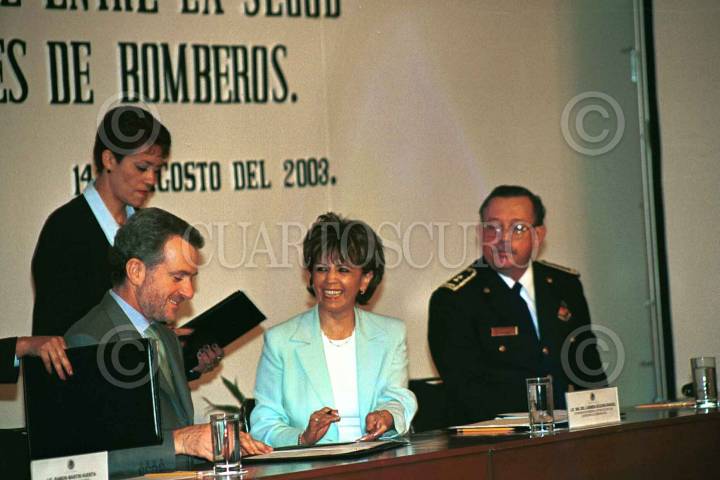 Santiago Creel, secretario de Gobernación, María del Carmen Segura Rangel, coordinadora de protección civil y el comandante Juan Antonio Quiroga, durante la firma del convenio en materia de Protección Civil y la SEGOB. FOTO: Eunice Adorno/CUARTOSCURO.COM