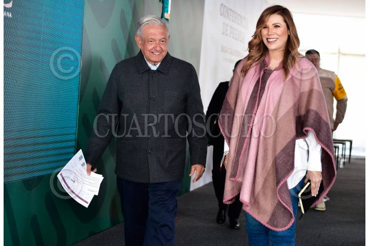 Andrés Manuel López Obrador, Presidente de México, y Marina del Pilar Ávila, gobernadora del estado de Baja California; durante la mañanera en Tijuana.