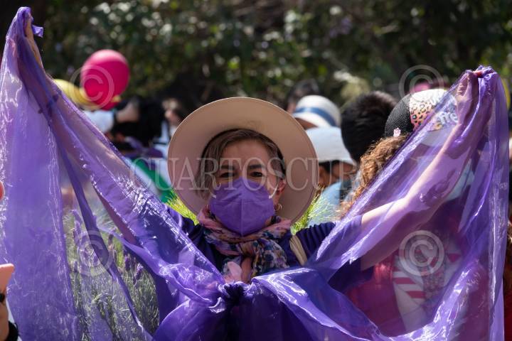 Una mujer extiente una manta morada durante el Encuentro de Mujeres por la Transformación en el Monumento a la Revolución.