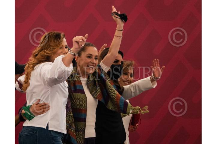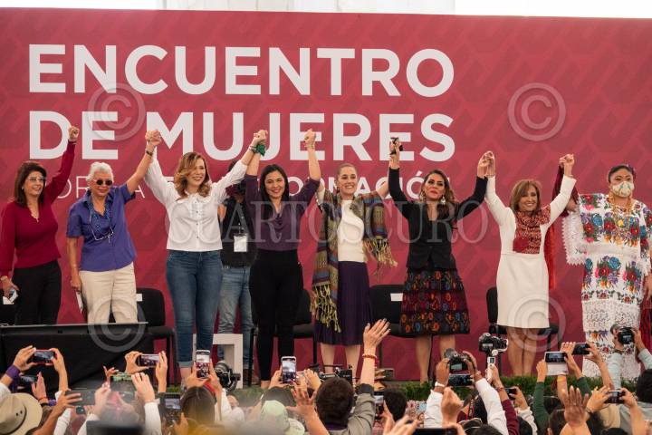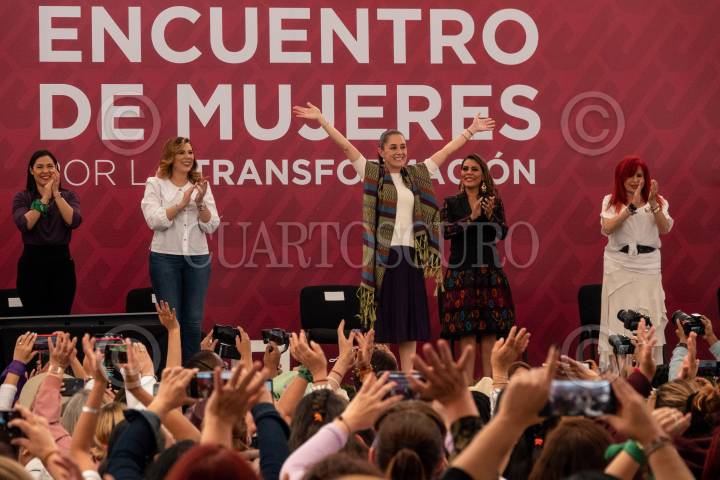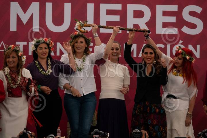 Lorena Cuéllar; Indira Vizcaíno; Maria del Pilar Ávila; Claudia Sheinbaum Pardo; Evelyn Salgado Pineda y Layda Sansores durante el Encuentro de Mujeres por la Transformación en el Monumento a la Revolución.