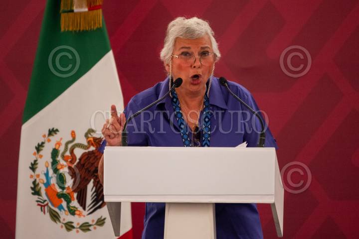Rosa Icela Rodríguez, secretaria de Seguridad y Protección Ciudadana, durante la conferencia mañanera en Tijuana, Baja California.