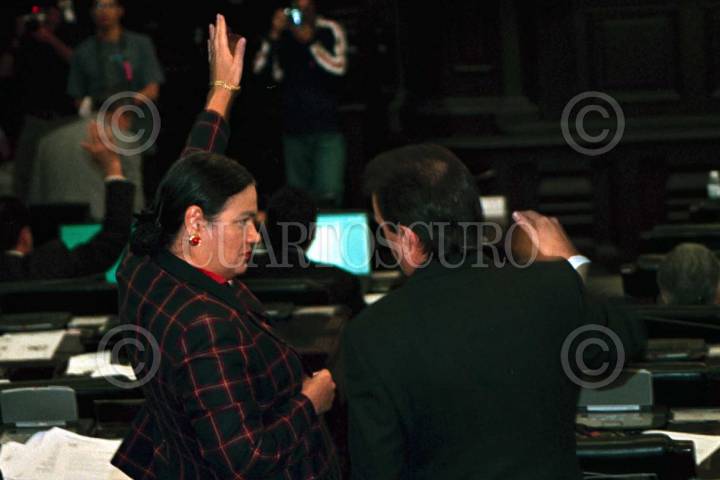 Los senadores priístas, Dulce María Sauri y Emilio Gamboa Patrón, (de espalda), durante la sesión en la Cámara Alta en donde se aceptarón propuestas del Ejecutivo, en la que se establece que esos 20 mil millones sean empleados para capitalizar la nueva Financiera Rural. FOTO: Eunice Adorno/CUARTOSCURO.COM