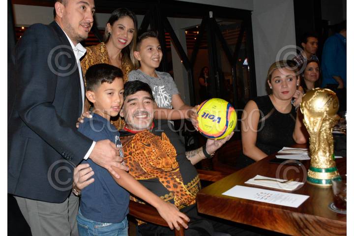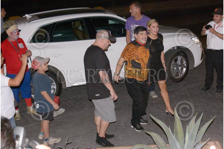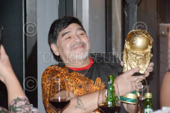CULIACAN, SINALOA. 06NOVIEMBRE2018.- El astro de fútbol Diego Armando Maradona, entrenador del equipo Dorados de Sinaloa, participó en la "Cena con Causa" para recabar fondos para donarlos a los damnificados de las inundaciones que provocaron las últimas tormentas y huracanes que afectaron la zona centro y sur del estado. El costo de la cena fue de 3 mil 500 pesos por persona, a las cuales se les regaló un balón autografiado por Maradona. También se subastaron réplicas de la copa del mundo autografiadas por el campeón; así como una playera autografiada por Pique. Maradona llegó a la cena de la mano de su novia Rocío Oliva, quien nunca se separó del astro de fútbol. FOTO: JUAN CARLOS CRUZ / CUARTOSCURO.COM