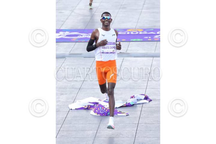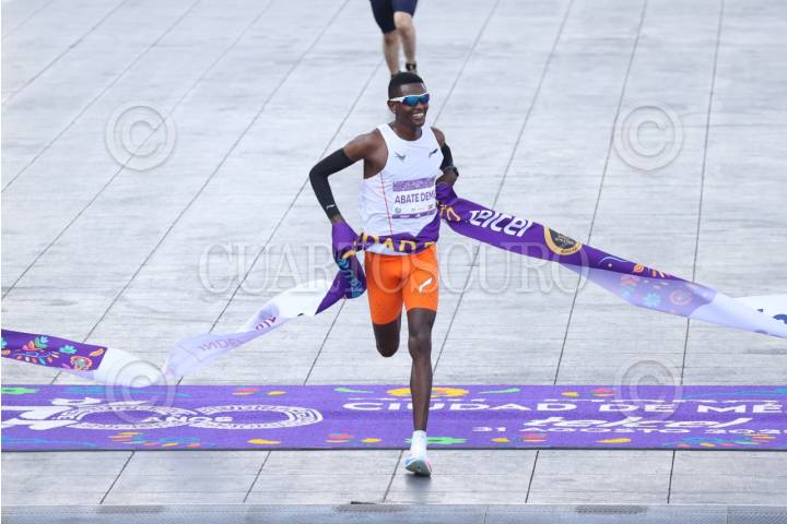 CIUDAD DE MÉXICO, 31AGOSTO2025.- Tadu Abate Deme, corredor de Etiopía, fue el ganador en la rama varonil del XLII Maratón de la Ciudad de México, con un tiempo de 2 horas con 11 minutos, al llegar a la meta del Zócalo. FOTO: MOISÉS PABLO/CUARTOSCURO.COM