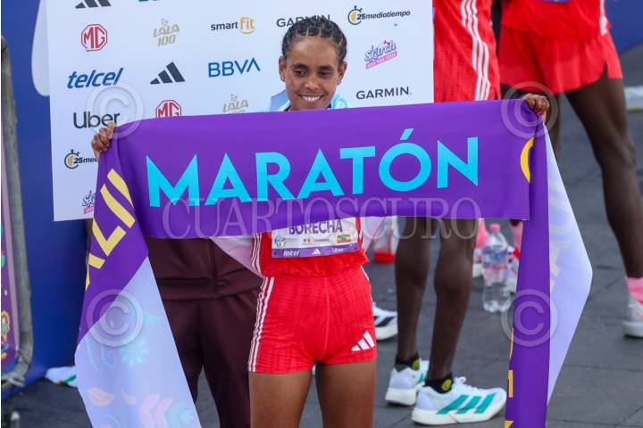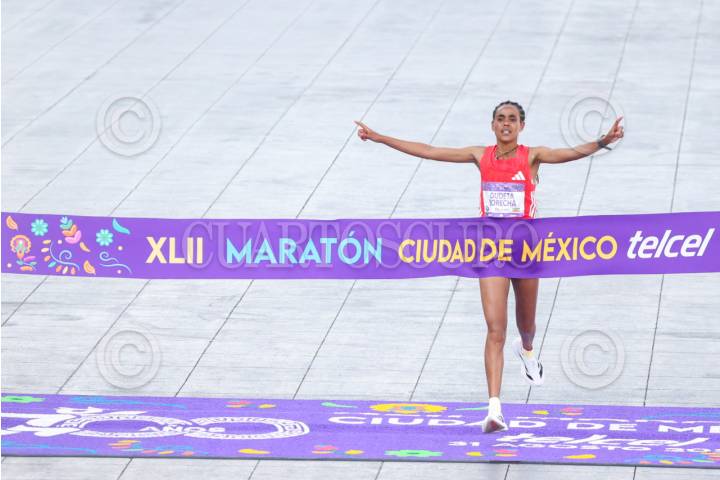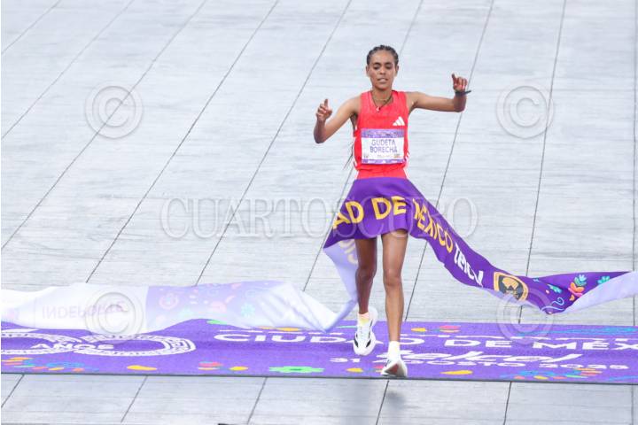 CIUDAD DE MÉXICO, 31AGOSTO2025.- Belekelech Gudeta Borecha, corredora de Etiopía, ganó en la rama femenil el Maratón de la Ciudad de México 2025. La corredora africana tuvo un tiempo de 02:28:36 al cruzar la meta en el Zócalo. FOTO: MOISÉS PABLO/CUARTOSCURO.COM
