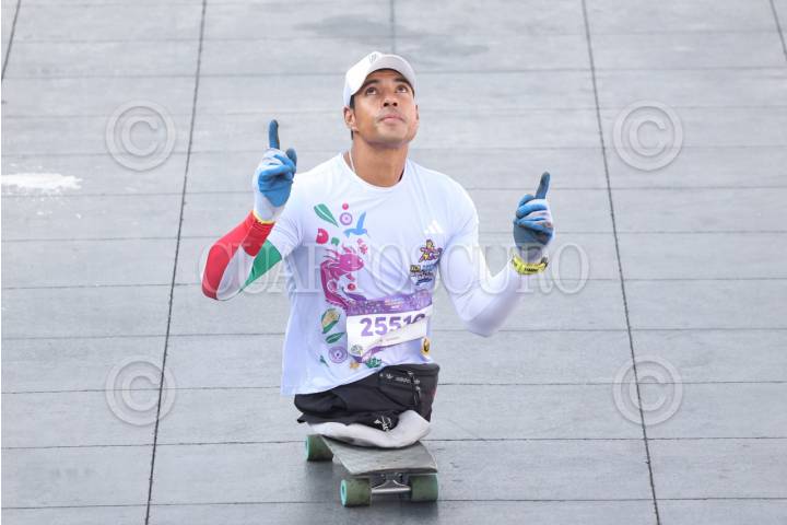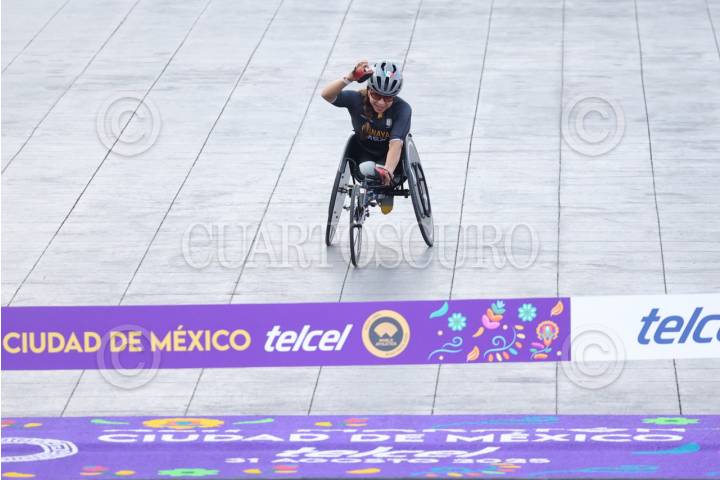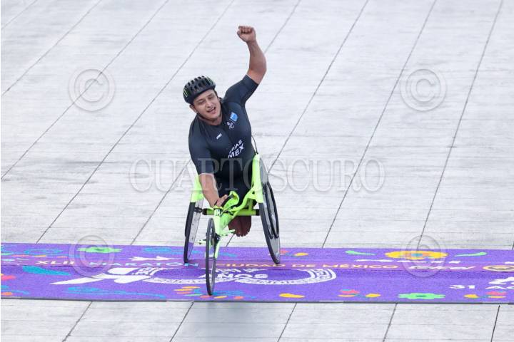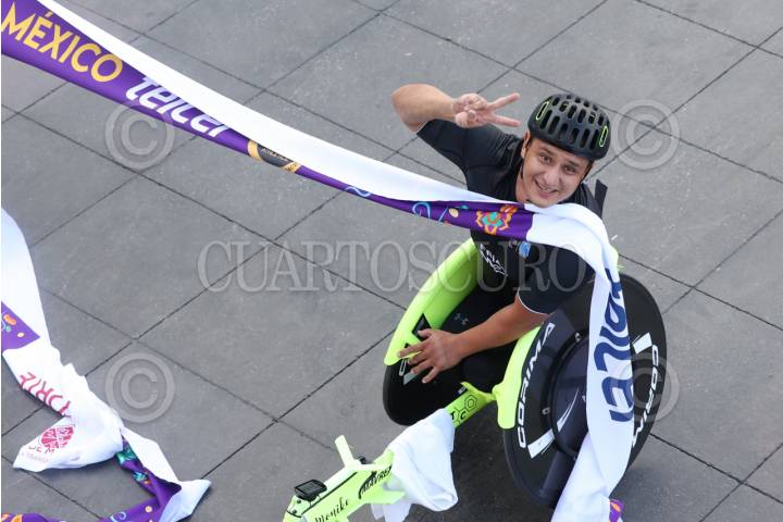CIUDAD DE MÉXICO, 31AGOSTO2025.- El para atleta Michel Muñoz Malagón cruza la meta del Maratón de la Ciudad de México, en el Zócalo. FOTO: MOISÉS PABLO/CUARTOSCURO.COM