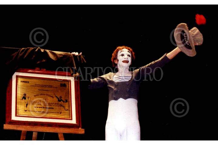 El gobierno del Estado de Chiapas homenajeó ayer por la noche al mimo francés Marcel Marceau, durante su presentación en esta ciudad, como parte de su gira mundial de despedida de los escenarios. FOTO: Oscar León/Corrsponsal/CUARTOSCURO.COM