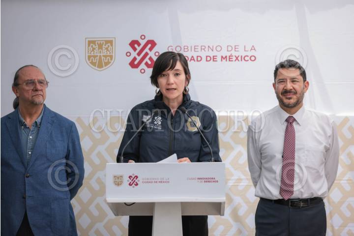 Ricardo Ruiz Suárez, Marcela Figueroa Franco y Martí Batres Guadarrama durante la conferencia de prensa en que se dieron detalles sobre el protocolo de seguridad para la marcha del orgullo LGBTTTIQPA+ 2023.