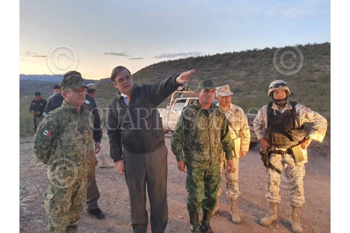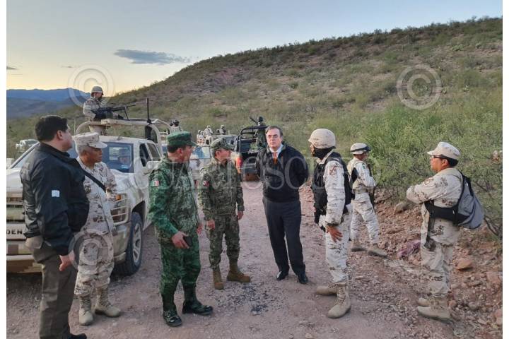 BAVISPE, SONORA, 05NOVIEMBRE2019.- Marcelo Ebrard, secretario de Relaciones Exteriores, realizó un recorrido en el municipio de Bavispe en Sonora, donde ayer fueron atacados integrantes de la familia LeBarón cuando viajaban en tres camionetas. En la zona se mantiene un operativo por Guardia Nacional y el Ejército. FOTO: CUARTOSCURO.COM