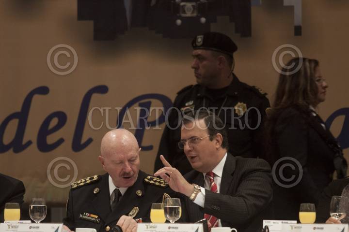 MÉXICO, D.F., 16NOVIEMBRE2012.- Marcelo Ebrard Casaubón, Jefe de Gobierno, y Manuel Mondragón y Kalb, secretario de Seguridad Pública del DF, durante el desayuno en donde se festejo el "Día del Policía". En su discurso el mandatario capitalino está a 10 puntos porcentuales de ser la ciudad más segura del mundo, al presumir que actualmente los índices delictivos se han reducido hasta en un 40 por ciento FOTO: MOISÉS PABLO /CUARTOSCURO.COM