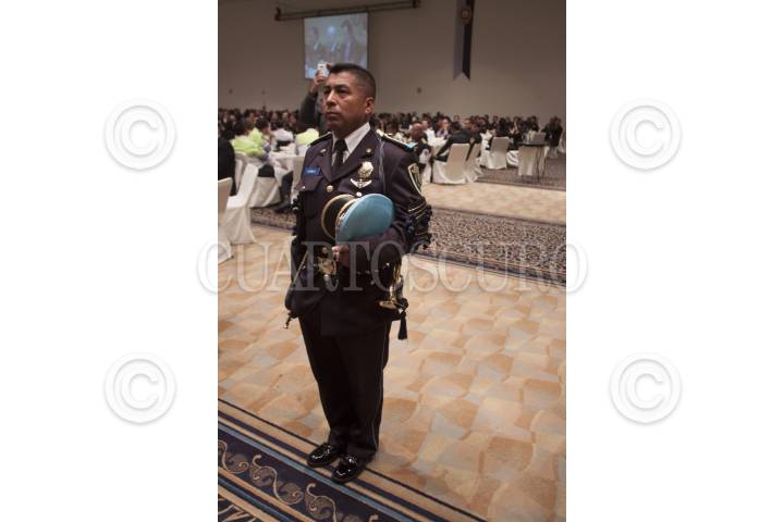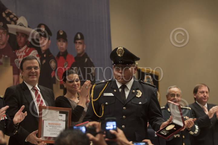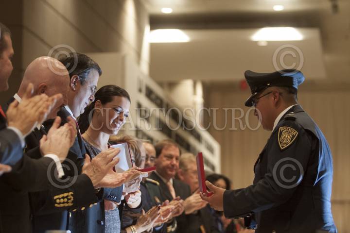 MÉXICO, D.F., 16NOVIEMBRE2012.- El Policia Preventivo Luis Ernesto Ireta Marroquín fue reconocido como "Policía Distinguido de la Ciudad de México" por el Jefe de Gobierno Marcelo Ebrard Casaubón, luego de que el pasado 30 de mayo salvó a un niño que se encontraba en el interior de un departamento que se incendiaba, esto fue durante el desayuno con motivo del Día del Policía. FOTO: MOISÉS PABLO /CUARTOSCURO.COM