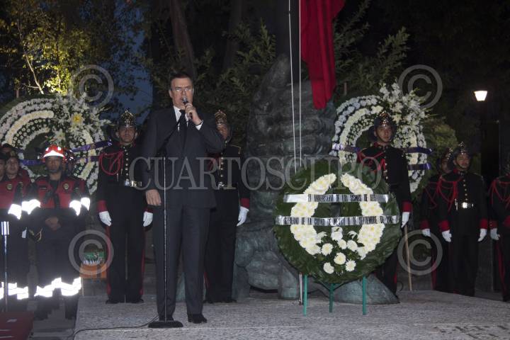 MÉXICO, D.F., 19SEPTIEMBRE2010.- Marcelo Ebrard, jefe de gobierno del Distrito Federal durante el izamiento de bandera en honor a los caídos en los sismos de 1985 en el asta de Plaza de la Solidaridad. FOTO: RODOLFO ANGULO /CUARTOSCURO.COM