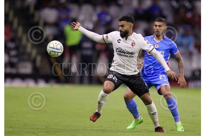 Alexis Canelo de Tijuana y Marcelo Escobar de Cruz Azul durante el partido de fútbol Cruz Azul vs Tijuana correspondiente a la jornada 9 del Torneo Apertura 2022 de Liga BBVA MX, en el estadio Azteca.