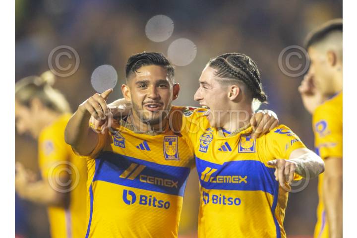 SAN NICOLÁS DE LOS GARZA, NUEVO LEÓN, 20ABRIL2024.- Jesús Garza y Marcelo Flores de Tigres, festejan el gol ante el Necaxa, en el estadio Universitario, partido correspondiente a la jornada 16 de la Clausura 2024 de la Liga MX. Marcador Final: Tigres: 5 - Necaxa: 2. FOTO: GABRIELA PÉREZ MONTIEL / CUARTOSCURO.COM