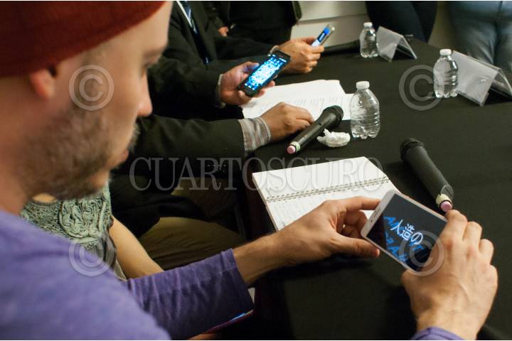 CIUDAD DE MÉXICO, 14NOVIEMBRE2017.- Conferencia de prensa para dar los detalles del Festival Internacional de Cine con Medios Alternativos, como tematica del evento, se les pidó a los asistentes que visualizaran el trailer del festival en sus telefonos celulares, siendo Marcelo Tobar quien inició con la actividad. FOTO: JESUS VERDUGO/ CUARTOSCURO.COM