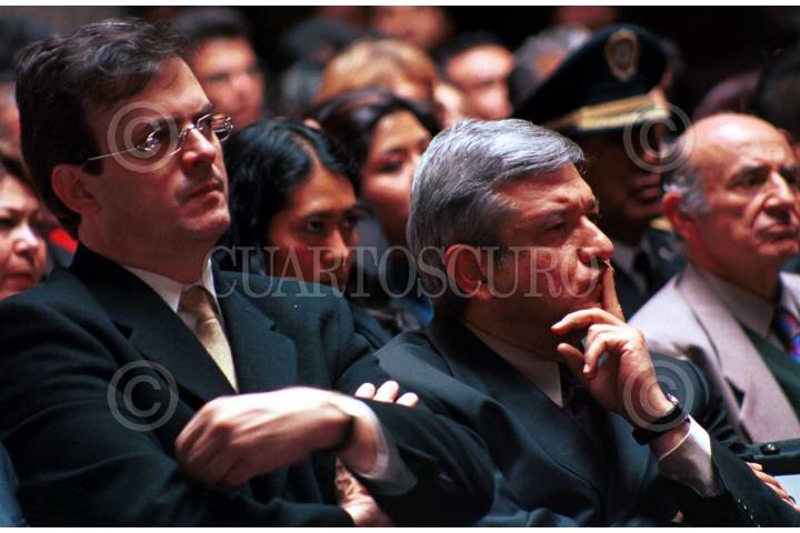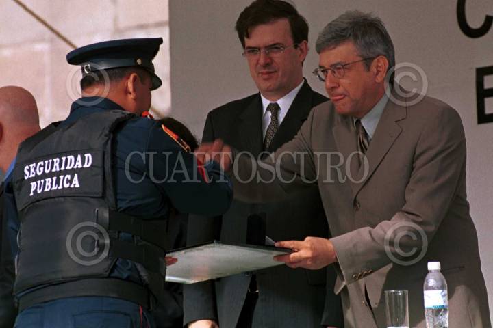 El jefe de gobierno capitalino, Andrés Manuel López Obrador, acompañado de Marcelo Ebrad, secretario de seguridad pública, entregó condecoraciones a la excelencia en el servicio a policias bancarios, preventivos y auxiliares de la ciudad FOTO: Oswaldo Ramirez/CUARTOSCURO.COM